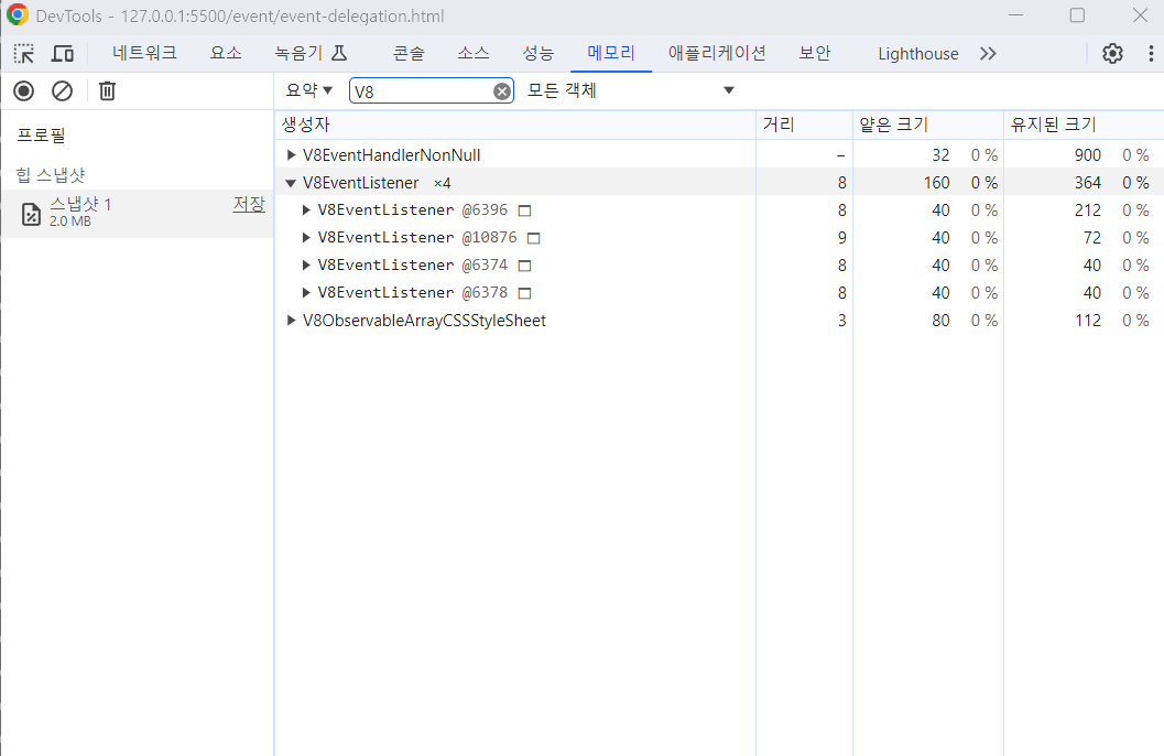 DevTools를 통해 똑같이 메모리 힙 스냅샷을 확인해보면 Object 만 렉시컬 환경 정보로 저장되어, 실제 메모리 사용량이 줄어든 것을 확인할 수 있습니다.